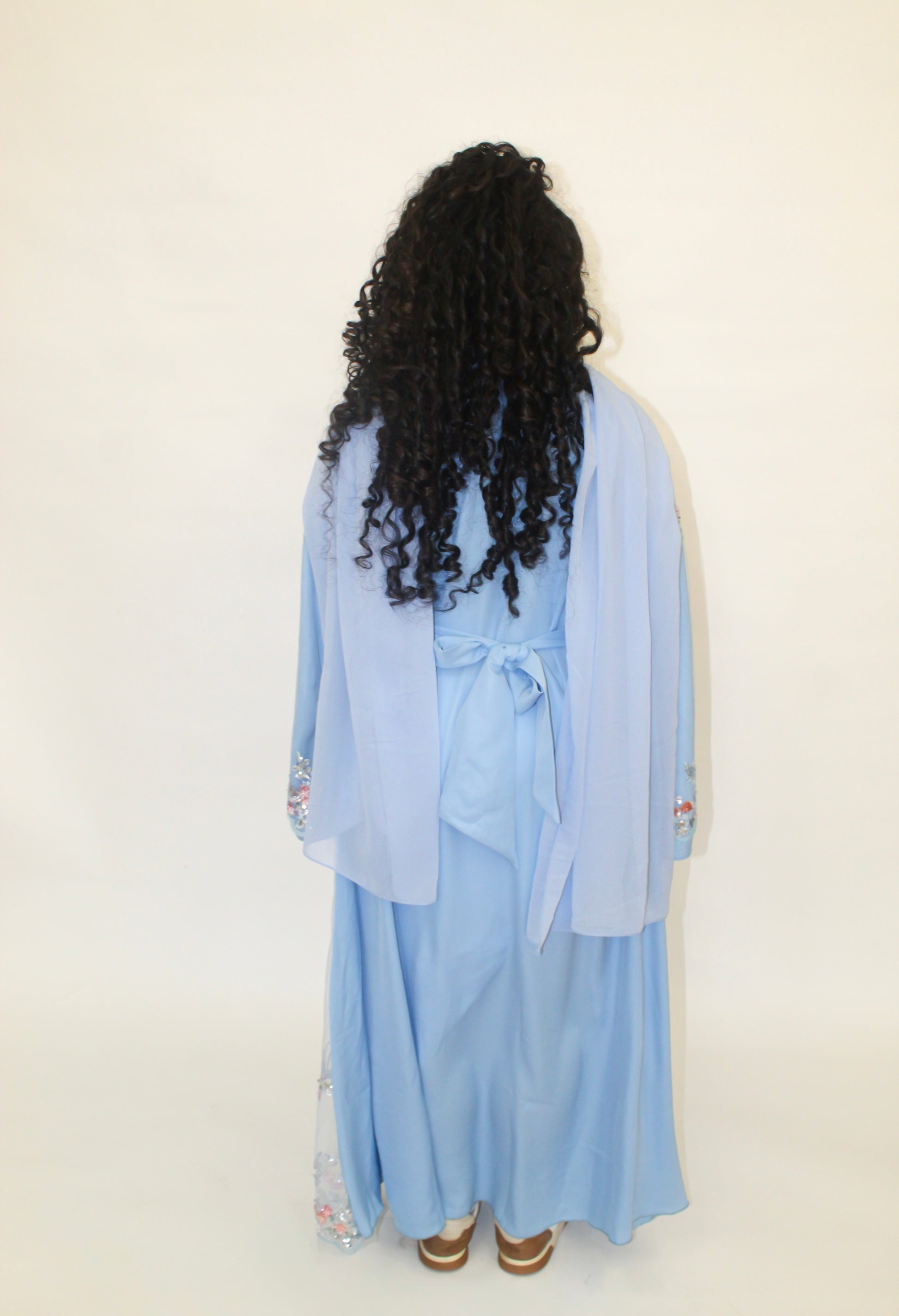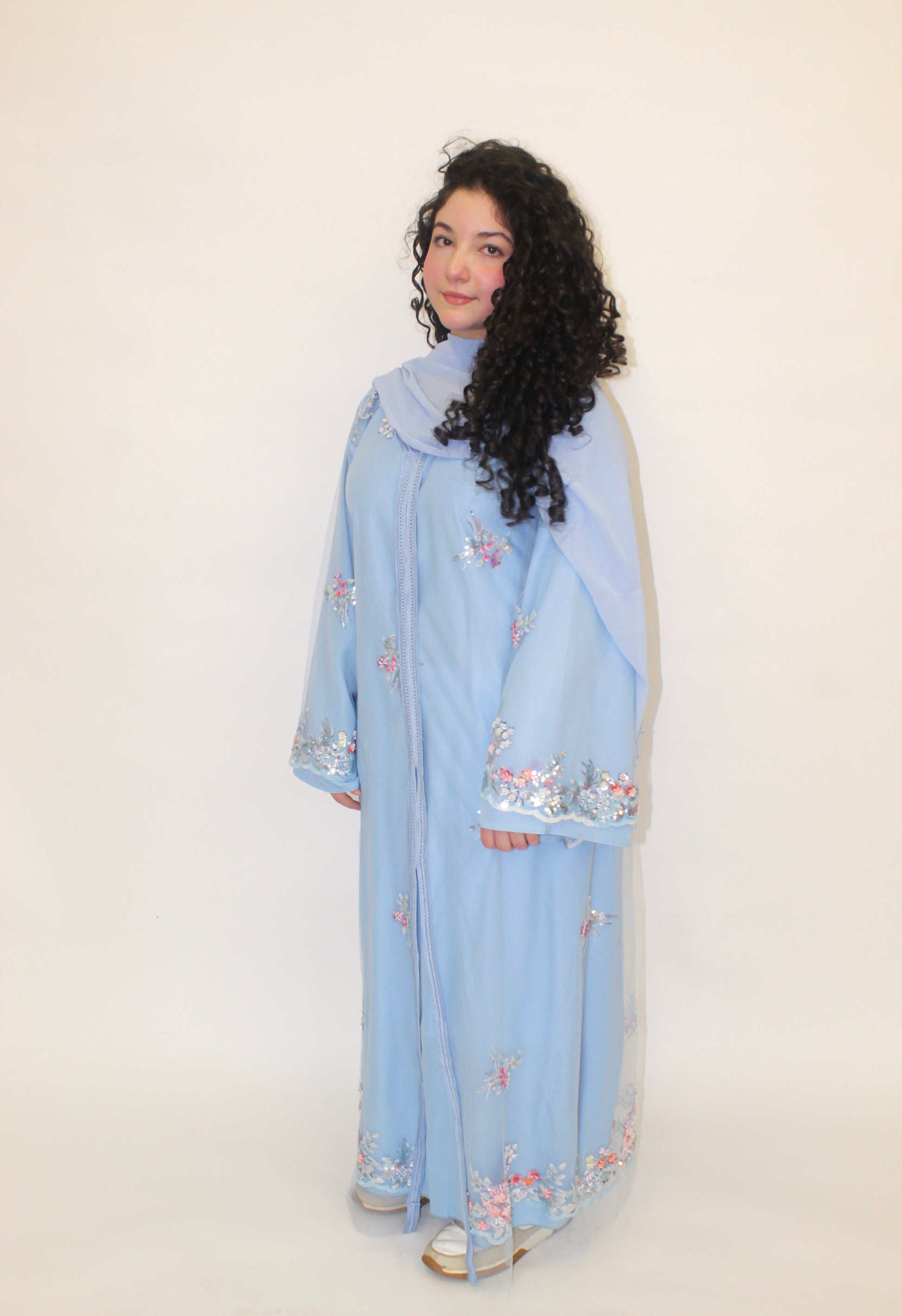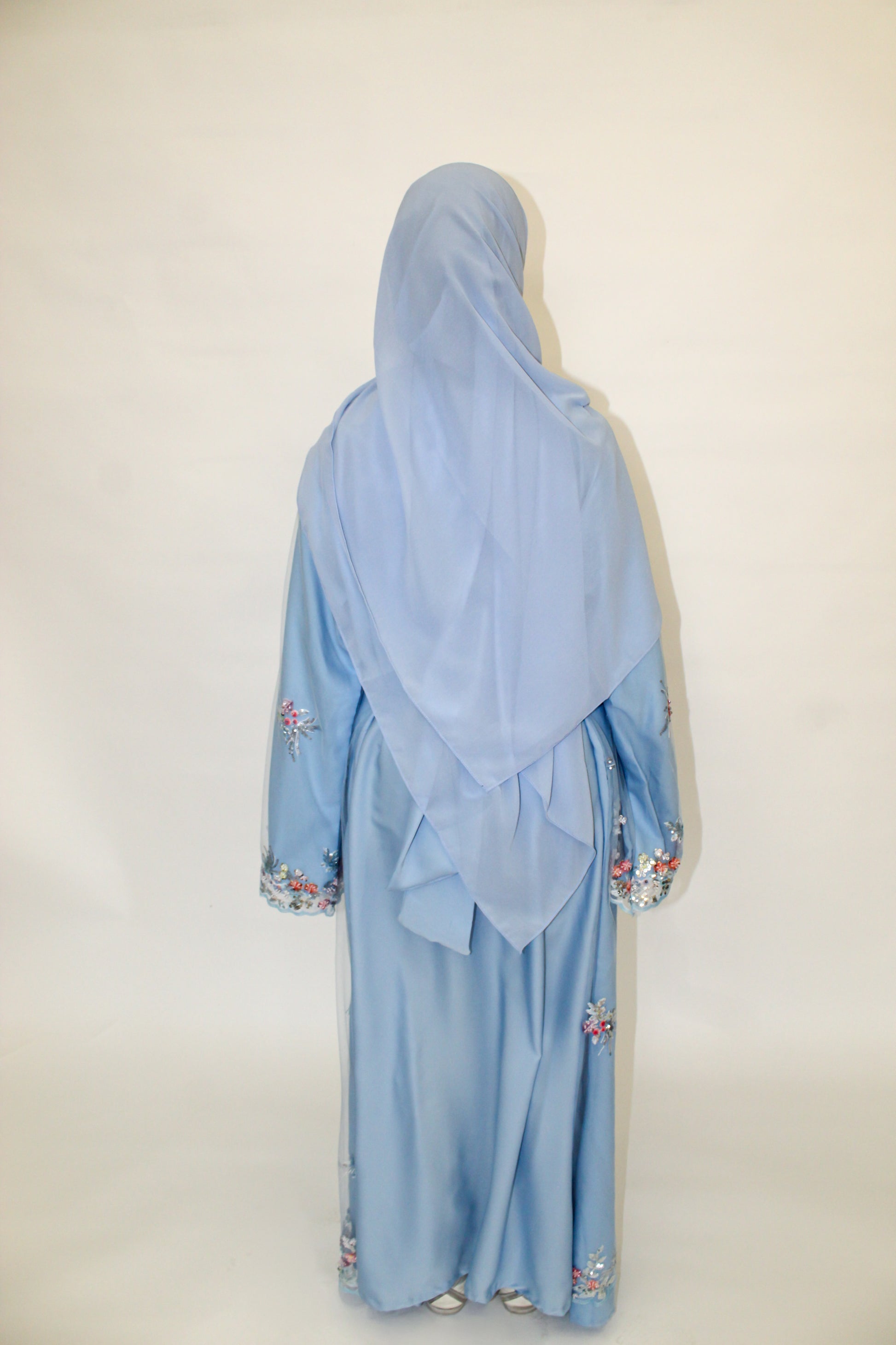 Introducing the Bluebell Abaya, a dreamy piece inspired by soft florals and delicate hues. Made in a beautiful powder blue, this abaya features a sheer net overlay adorned with intricate pink, purple, and cream floral embroidery and subtle sequins. Its delicate beauty makes it perfect for special occasions and intimate gatherings. This abaya comes complete with a matching hijab for a coordinated look.