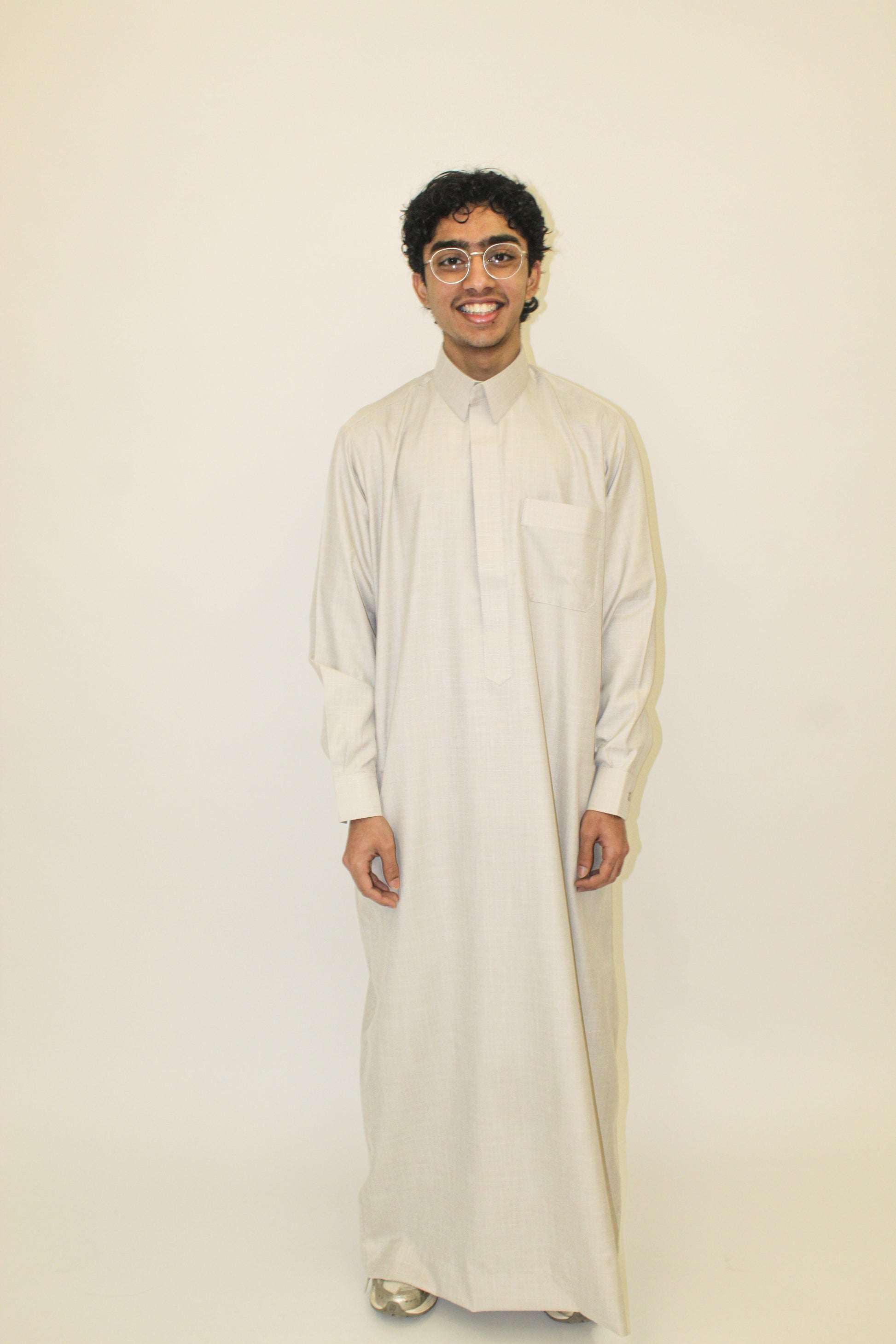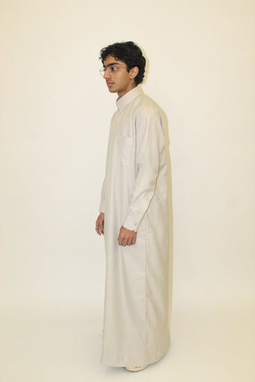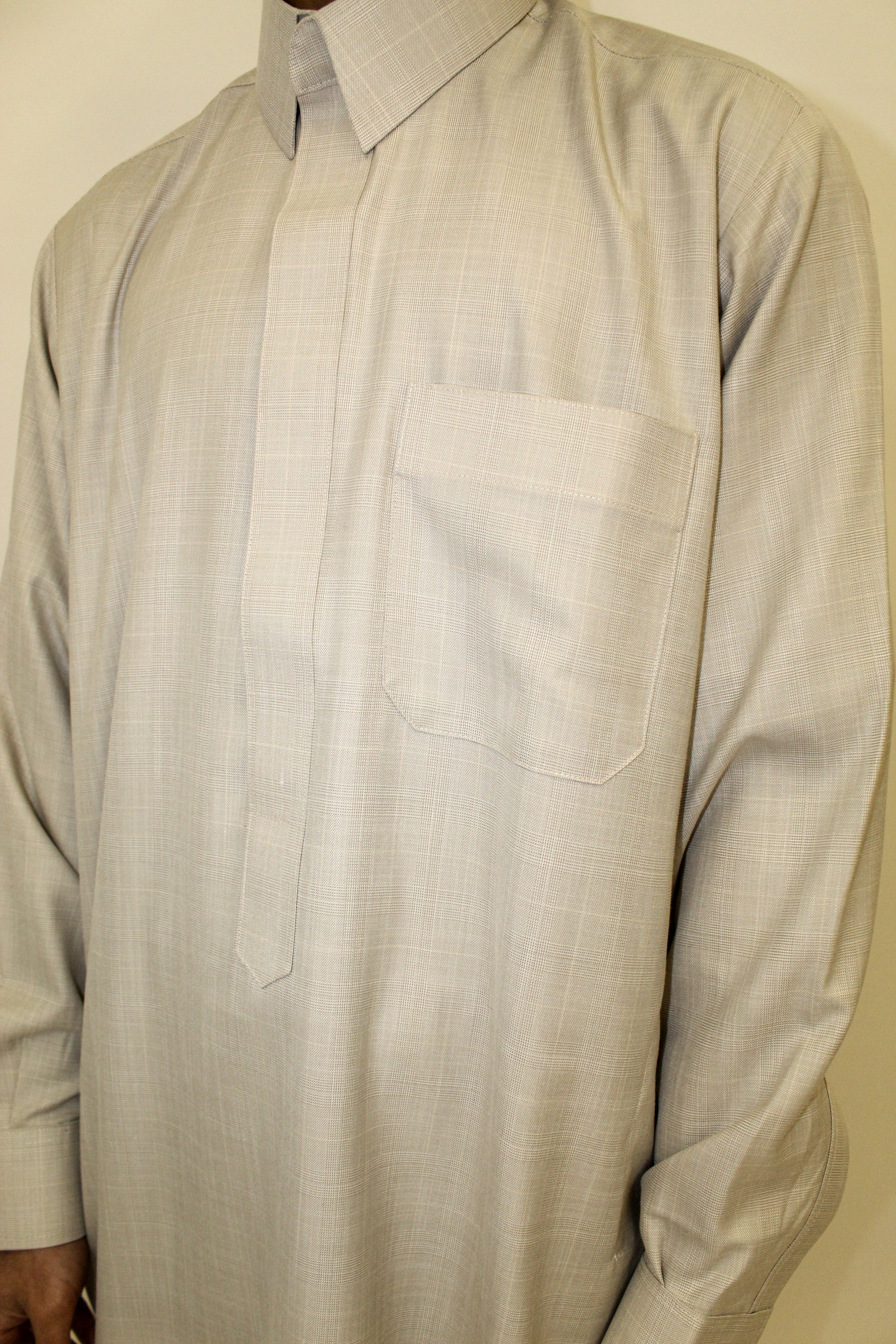 Tailored from a premium heavyweight wool blend, the Chai thobe features a structured shirt collar and cuffed sleeves. Designed in a light beige tone with a faint checkered pattern, it’s named after our favorite post-taraweeh drink — warm, comforting, and timeless.