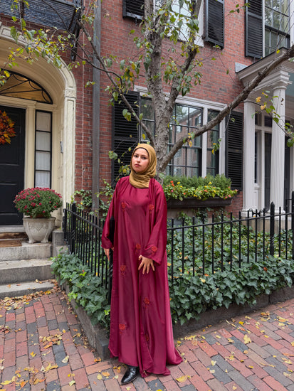 Introducing the Cherry Abaya, a burgundy two-piece set made from Nida fabric with a soft sheen finish. This elegant abaya features intricate hand-embroidered burgundy florals on both the inner and outer piece, adding a touch of luxury to your wardrobe.