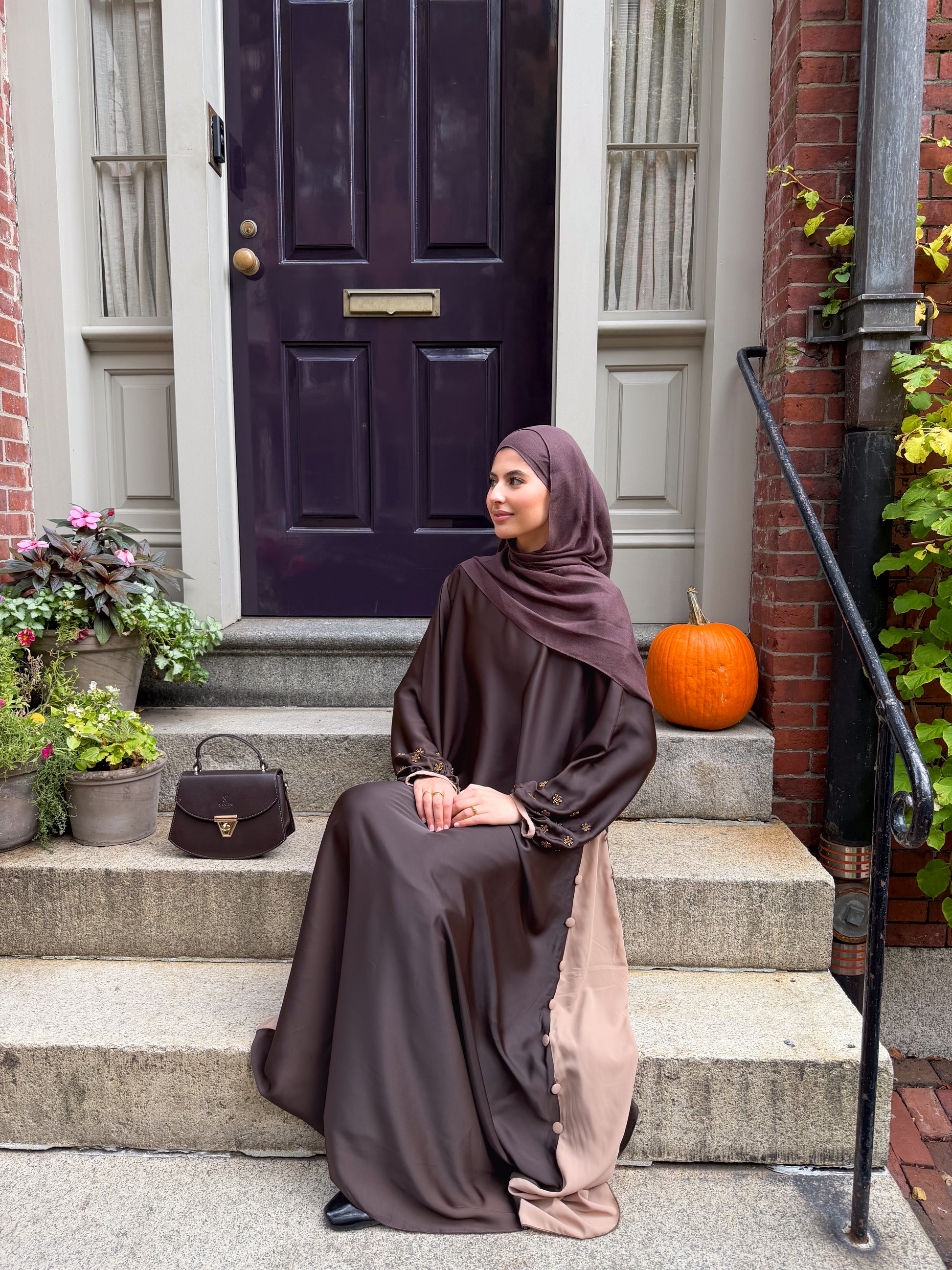 Introducing the Cocoa Abaya, a stunning cool dark brown piece made from Nida fabric with a soft sheen finish. This elegant abaya features subtle tan side openings adorned with matching buttons, allowing you to customize your look—whether you prefer a closed silhouette or a more relaxed, open style.