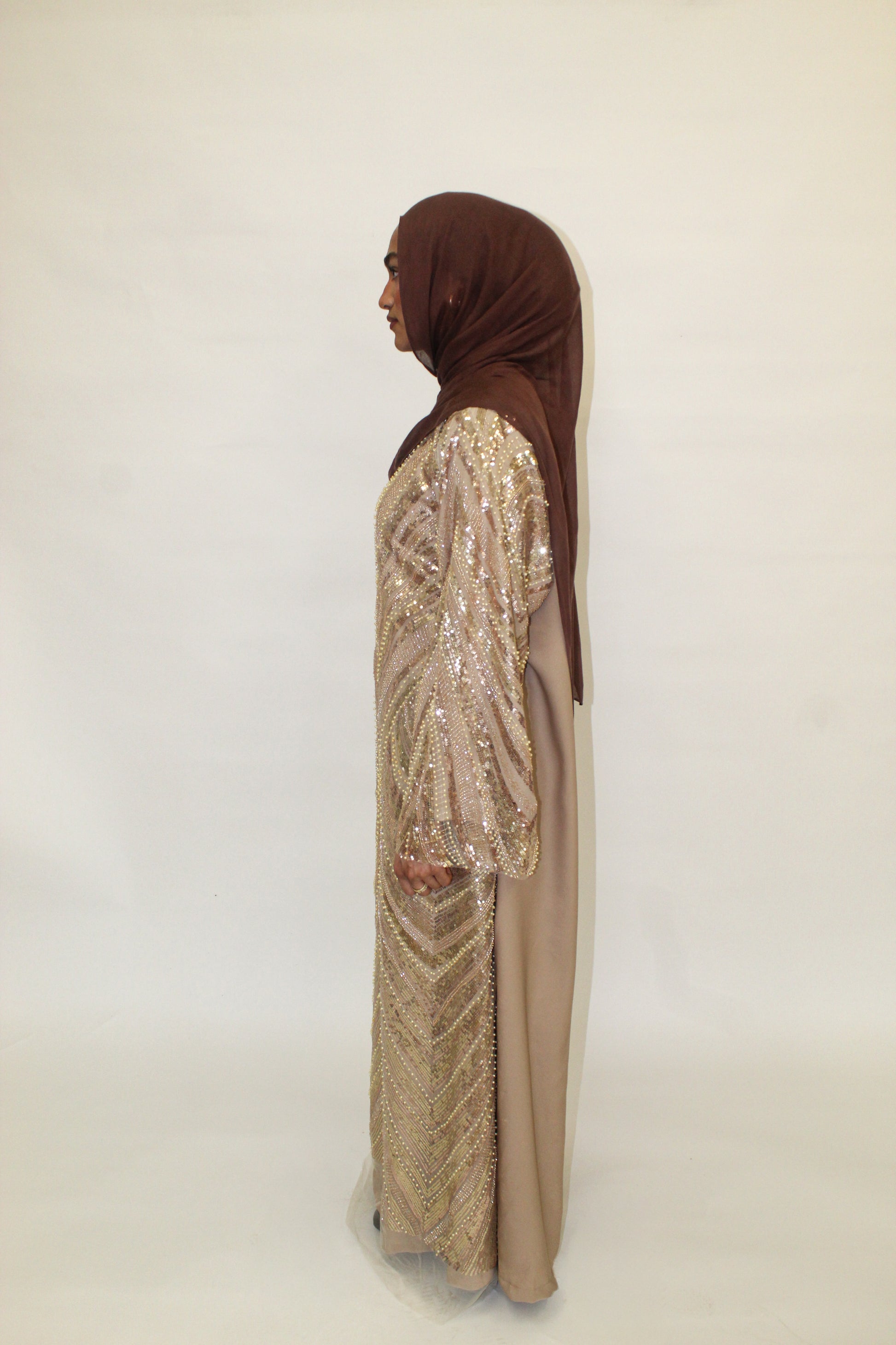 Introducing the Golden Hour Abaya, a bright and radiant piece inspired by the sun. Adorned with shimmering gold sequins and pearls throughout, this abaya is made to shine from every angle. The detailing creates a stunning effect, making it the perfect choice for formal events and special celebrations.