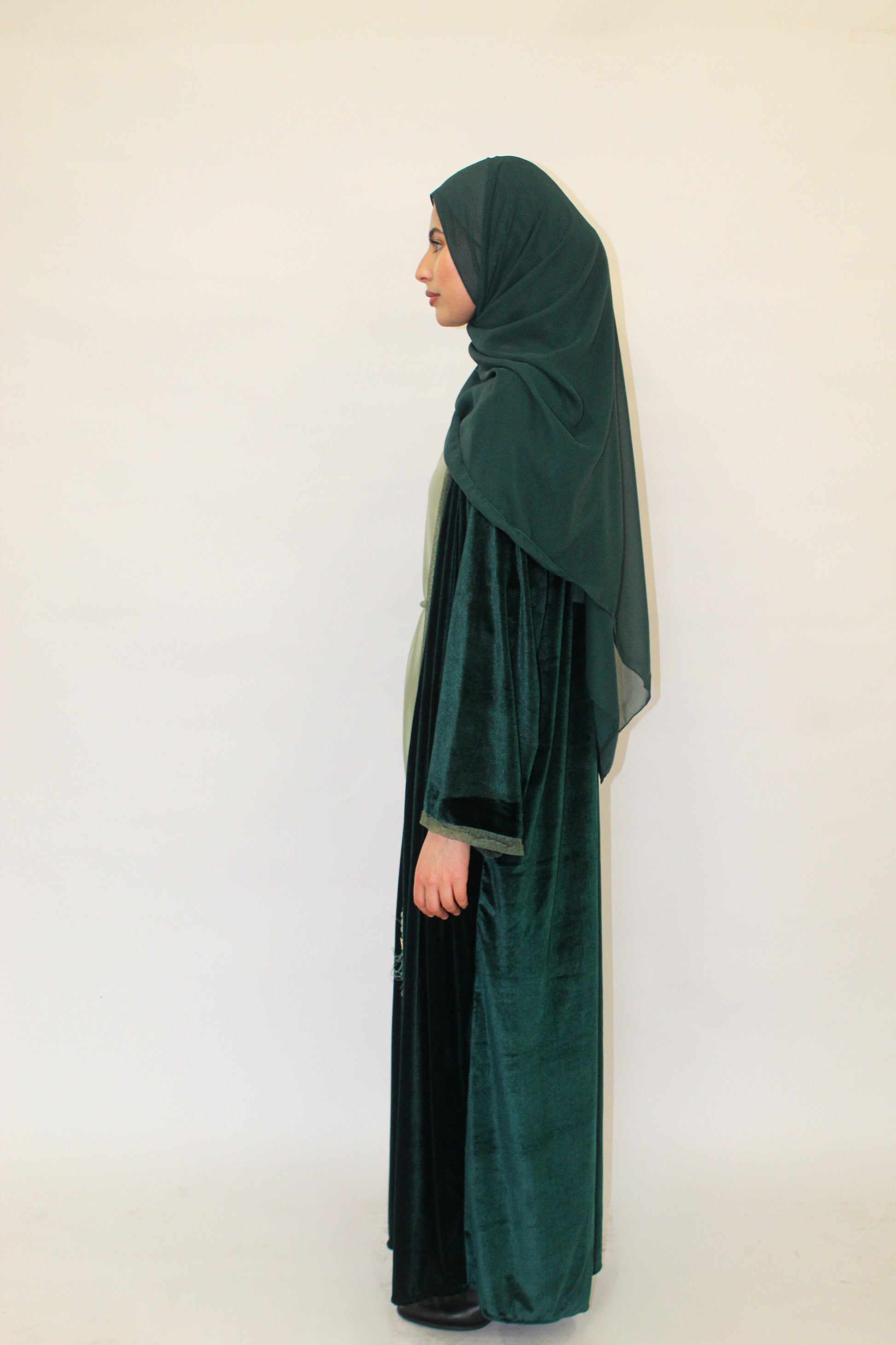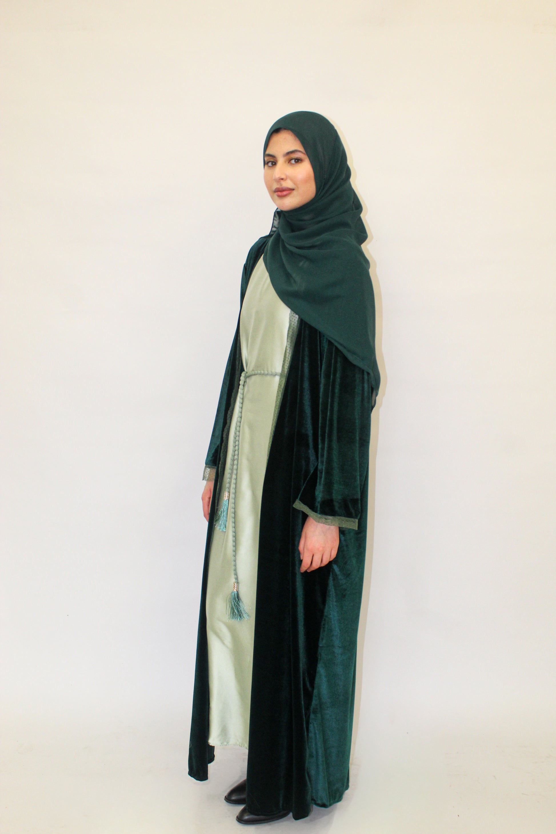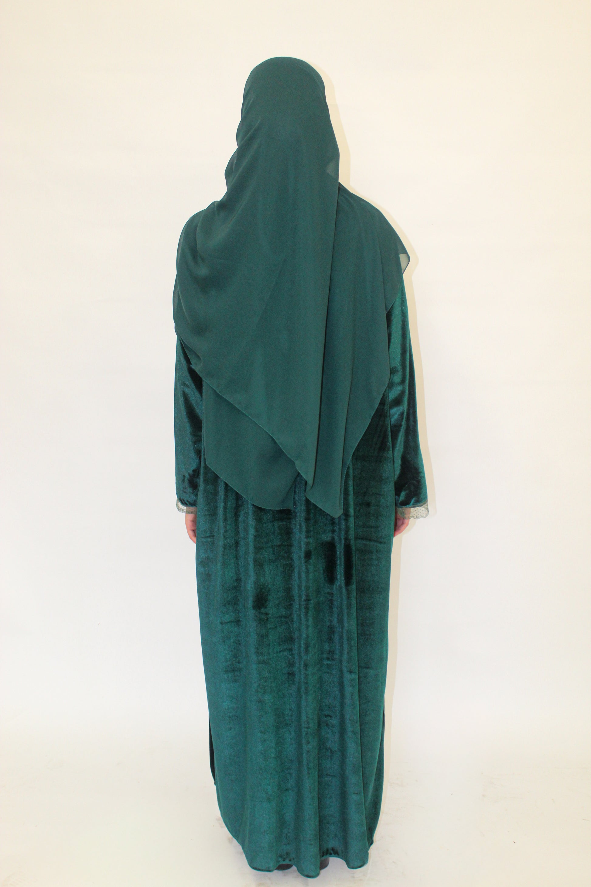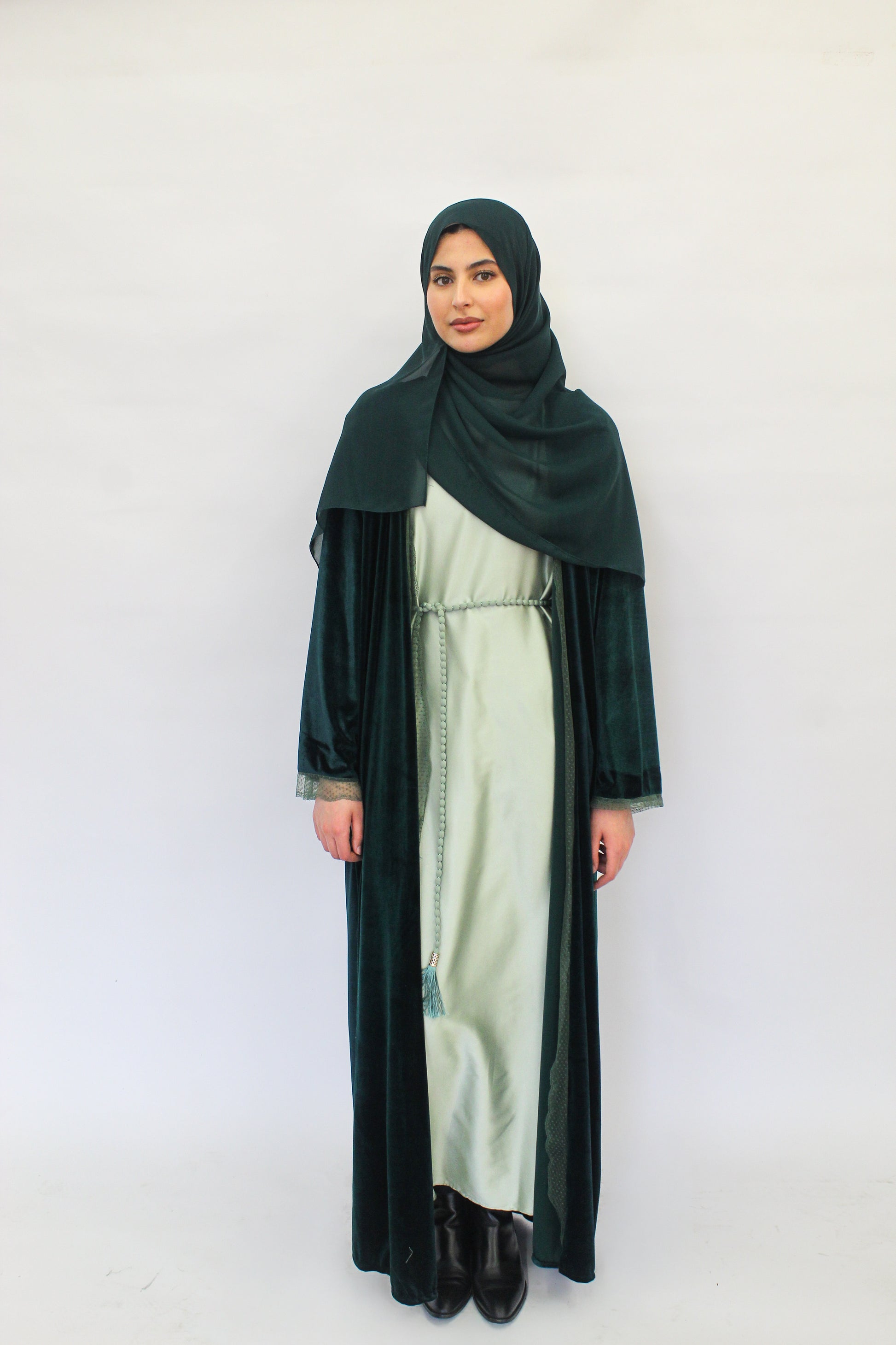 Introducing the Jade Night Abaya, crafted in luxurious emerald velvet with delicate lace borders for a refined, timeless finish. Designed with a light green short-sleeve satin lining for contrast and comfort, it drapes beautifully for any special occasion. Style it with or without the included tie to create a defined or flowing silhouette. This abaya comes with a matching chiffon hijab.